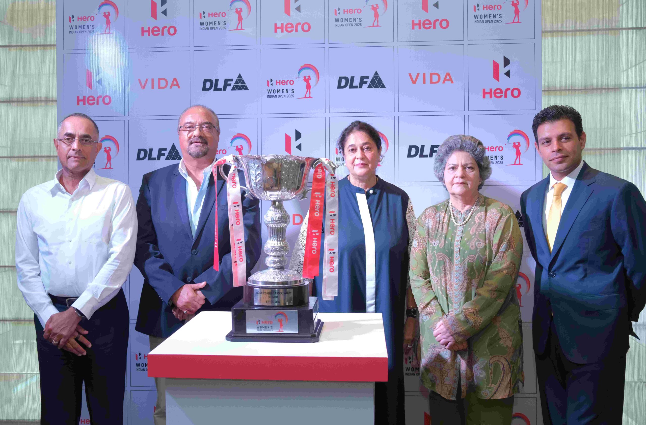 Devin Narang, Vice President, WGAI; Sanjay Bhan, Executive Vice President, Hero MotoCorp; Kavita Singh, President, WGAI, Champika Sayal, Secretary General, Women’s Golf Association of India; Tusch Daroga, Vice President, DLF Golf and Country Club with the Hero Women’s Indian Open trophy